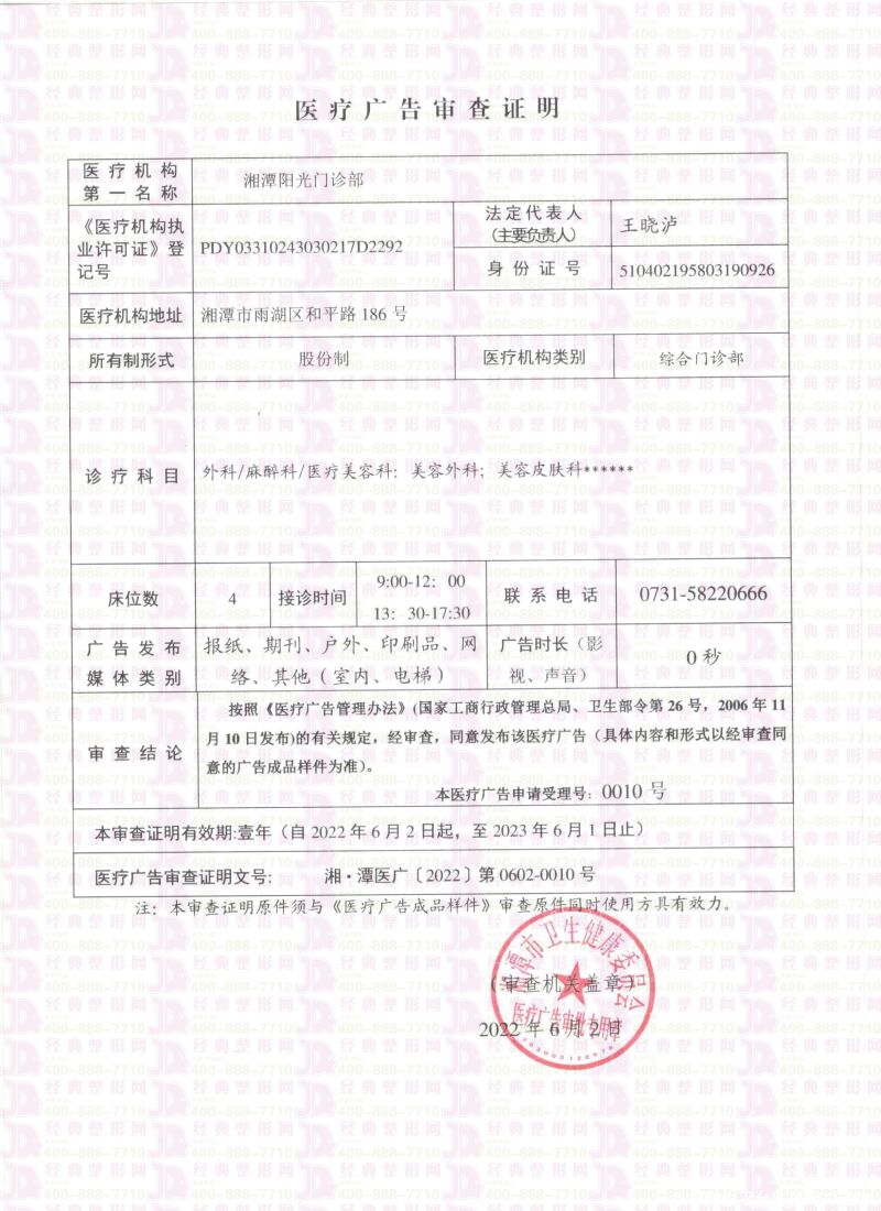 機構名稱:湘潭陽光醫(yī)療美容門診部
